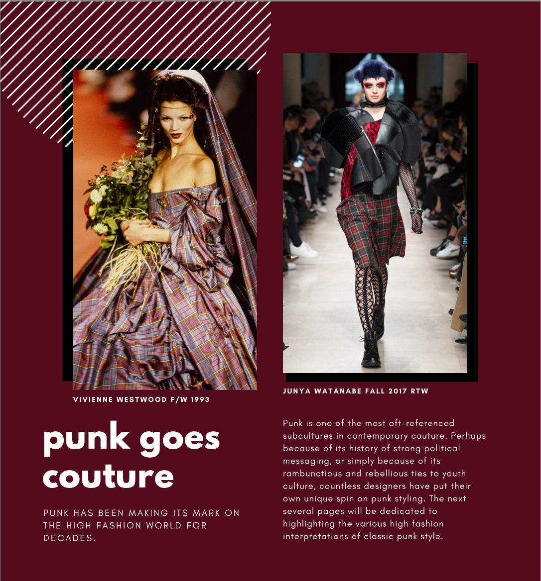 This is a zine I designed that explores the influence of punk on streetwear and couture. I aimed to capture the spirit of punk through my design choices while still maintaining beauty and readability.